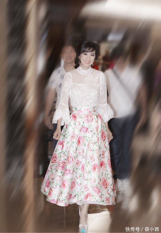 下半身的玫瑰印花半身裙与白色蕾丝形成绝美呼应,大朵的粉色玫瑰印花明艳却不俗气,高腰线的设计直接拉长身材比例,蓬松的伞裙版型藏肉又显瘦,还能增添少女感。再加上裙摆长度落在小腿中部,刚好可以露出纤细的脚踝,搭配浅色高跟鞋,进一步强化了优雅的气质,整套造型以白色和粉色为主调,柔和的色彩搭配让68岁的米雪看起来气色绝佳,甜美的风格完全打破了年龄的界限。